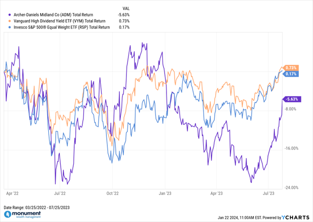 Now, before you panic: Monument does not currently have this stock in one of our investment models, but we did have it in our Dividend Model from March 2022 to July 2023. The following graphic represents approximate model performance during that holding period. Compliance note: this chart is indicative of the total return of $ADM for the relevant holding period using closing prices (not model entry and exit prices) and is not necessarily indicative of any client’s actual performance.